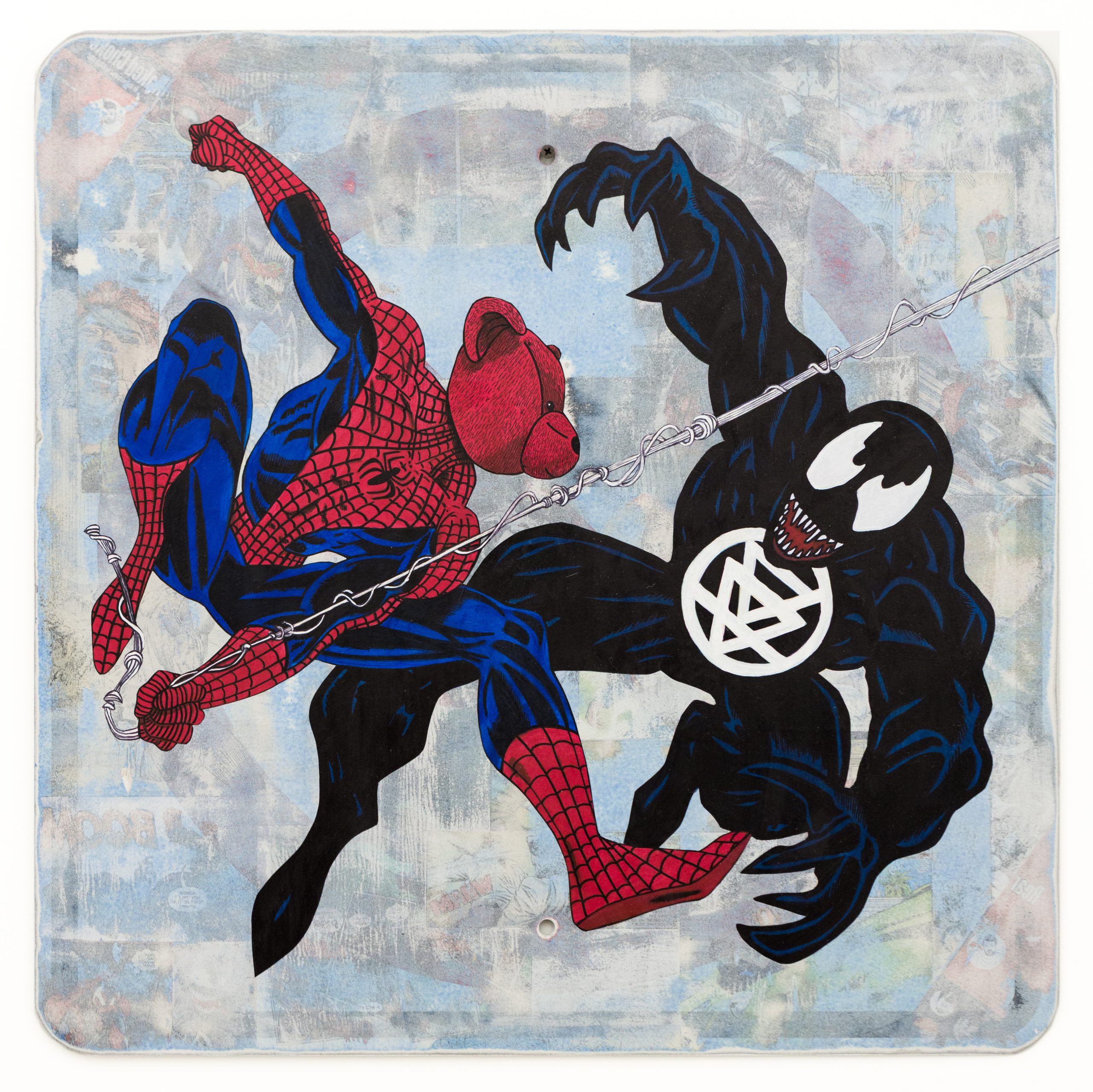 L’artista Sean 9 Lugo ha collaborato con Doomed Future per creare una serie di opere d’arte a tema Spiderman, in cui il famoso supereroe ha per testa l’orsacchiotto caratteristico di Lugo.