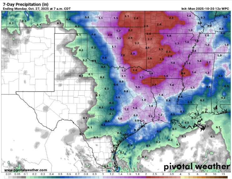 I totali della pioggia sembrano promettenti, dato che la copertura delle tempeste potrebbe essere compresa tra il 40% e il 60% nel Texas centrale, e i totali di pioggia previsti oscillano tra mezzo pollice e un pollice.